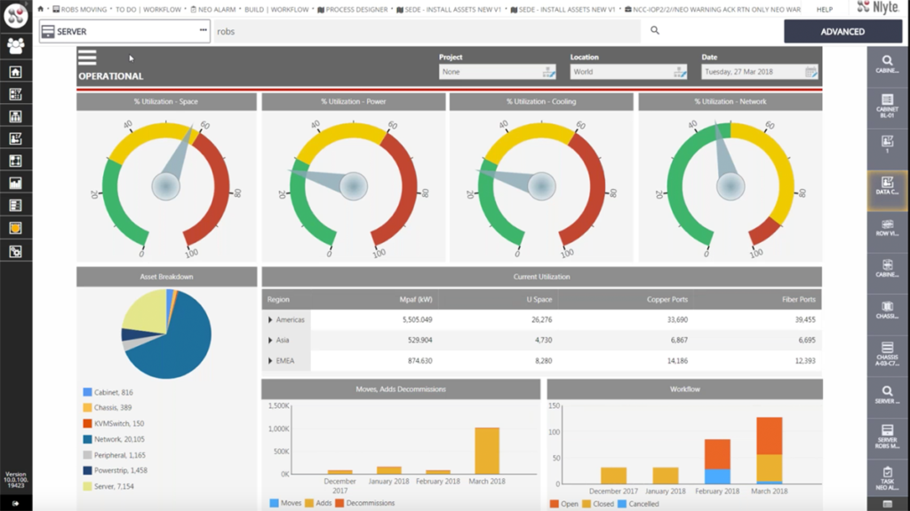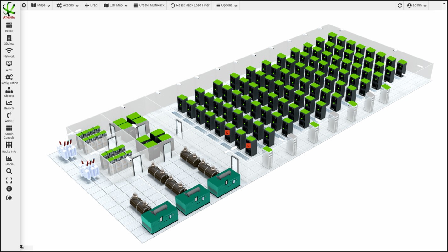 Operasyon yönetimi sistemlerinde veri merkezlerinin beyaz alanları racklardan kabinetlere, gruplardan koridorlara kadar detaylı olarak modellenir. Bu sistemde aktif cihazlar PDU’lar izlenir ve bazıları kontrol edilir. Bu izleme ve kontrol işlemleri kimi veri merkezi yazılımlarında 3 boyutlu modelleme kullanılarak modellenir. BMS ve PMS sistemlerinde olduğu gibi DCIM sisteminde de acil durum fonksiyonları vardır.