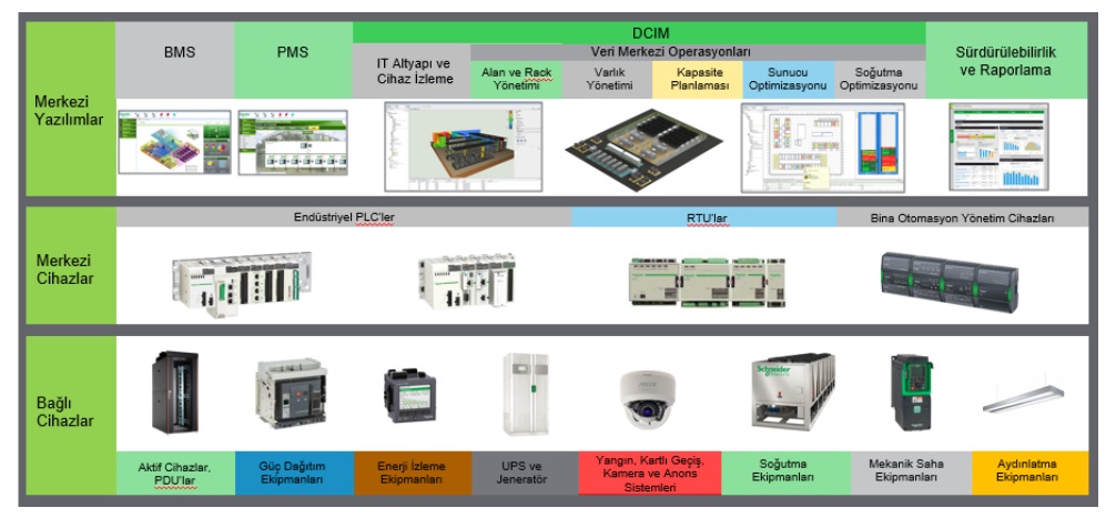 Bu sebeple veri merkezlerinin yönetimini daha kolay, daha güvenli ve daha ekonomik hale getirmek için yapılan her çalışma, elde edilen her araç giderek daha önemli hale gelmekte. Bu sebeplerden dolayı veri merkezlerini daha güvenli, operasyonları ise daha ekonomik ve kolay yapan BMS, PMS ve DCIM sistemleri gelişerek geleceğimizi kurmamıza yardımcı olmaktadır. Veri merkezlerinde kullanılan bu farklı sistemler ve sistemlerin merkezi yönetim cihazları, saha ekipmanlarıyla, BacNet, Modbus, LonWork ve direk Ethernet gibi bir çok yolla haberleşebilir. Bu merkezi yönetim cihazları yükün kritiklik durumuna göre kimi zaman bir PLC ya da RTU olabilir. Farklı alanları yöneten bu cihazların oluşturduğu BMS, PMS ve DCIM sistemleri için en ideali yazılım bazında entegre olmalarıdır. Veri merkezlerinde sistemler arasındaki uyum oldukça kritik olduğu için bu sistemlerin aynı tedarikçi tarafından tedarik edilmesi ve devreye alınması tercih edilir.